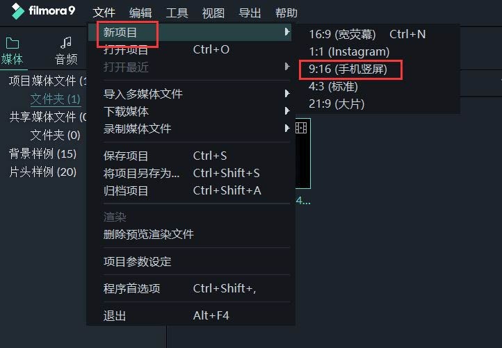 依次点击上方的【文件】-【新项目】-【9:16】。