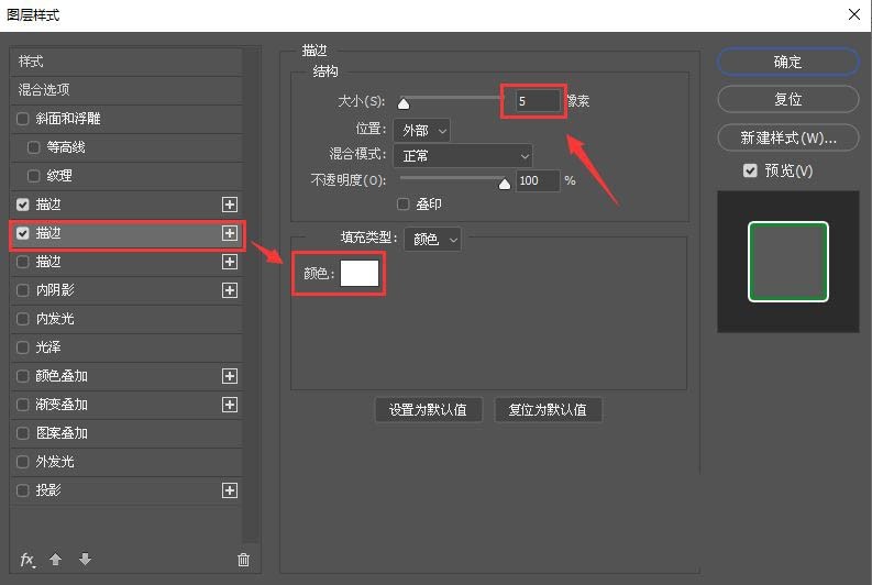 接着,我们把第二个描边的颜色设置为白色,大小为【5】像素,如图所示。