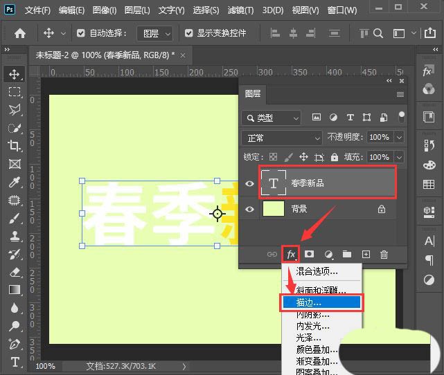 我们选中文字,然后在图层中点击【FX】选择【描边】,如图所示。