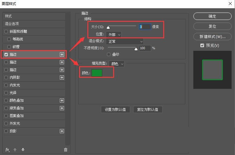 我们把第一个描边的颜色设置为深绿色,大小为【3】像素,位置选择为外部,如图所示。