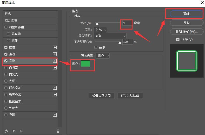 我们把第三个描边的颜色设置为浅一点的绿色,大小为【9】像素,点击【确定】,如图所示。