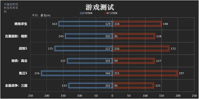 参考酷睿i7-9700k和锐龙R7 3700X游戏评测,测试的游戏有:绝地求生、古墓丽影:暗影、战地5、地铁:离去、鬼泣5、全面战争三国,测试结果如下: