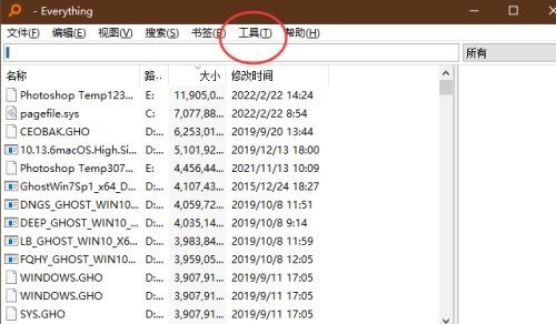 1、首先打开Everything软件,点击上方菜单栏中的"工具",如下图所示。