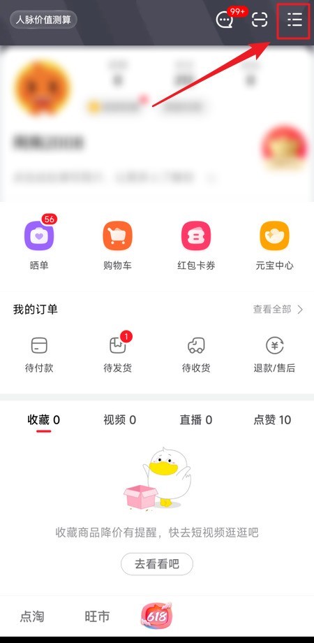 1、首先在点淘【我的】界面右上角,点击三横图标按钮。