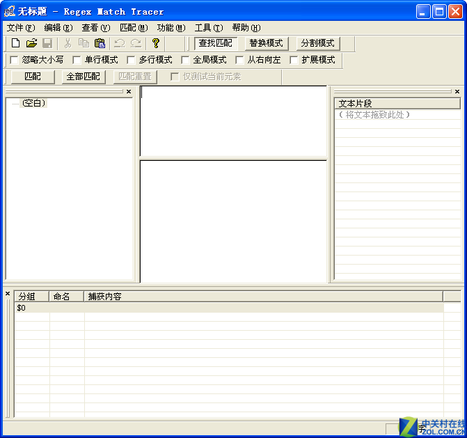 正则表达式工具 Match Tracer 是一款用来编写和测试正则表达式的工具软件!本软件通过可视化的界面,可以协助你快速、正确地写出复杂的正则表达式!程序员们的好帮手哦!!MTracer2.0全名是RegexMatchTracer,官方主页在regexlab.com。上面说最近更新日期是2007.10.07,不过,从我今天下载的程序的修改日期来看,是2008.09.13。变化是,之前作者提供的是绿色的程序,现在提供的是msi的安装包。 本文以下提到MTracer时,若无特殊说明,均指MTracer2.0 作为一款正则表达式撰写辅助程序,它拥有查找匹配、替换模式、分割模式,可以分别进行相应操作。前两种用的比较多,各种语言或正则式工具都有相应语句或函数来实现;第三种分割模式是指使用正则表达式来描述字符串的分割符,以便将字串分割成子串数组。