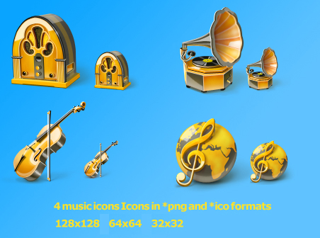 乐器PNG图标,包含小提琴、CD唱片机...包括32*32、64*64、128*128