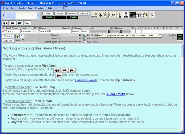 MIDI制作软件Anvil Studio 可以录制、编写、混声的音乐软件,包含各种音乐控制、过滤器等。可以剪切,复制,黏贴音轨。可以实现远程控制音乐的录制,播放和停止。用免费版本可以制作无限长度的midi文件和一分种的音轨文件。Anvil Studio 的主要设计目的是;1.从 MIDI 乐器录制音乐;2.利用 MIDI 乐器作曲;3.控制 MIDI 乐器编曲;4.透过计算机声卡播放 MIDI 乐曲档案;