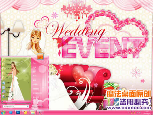 原创美丽新娘桌面主题,主题以捧着花束的漂亮新娘为背景,采用粉红色基调将整个界面装饰得甜蜜、浪漫、温馨。