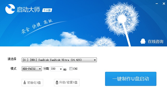 启动大师是一款免费的U盘启动盘制作工具,一键全自动完成启动U盘制作彻底抛弃光驱和光盘,无需任何技术基础,一键自动完成制作。