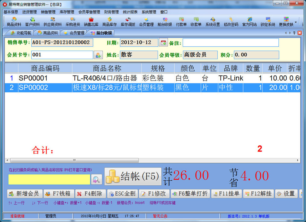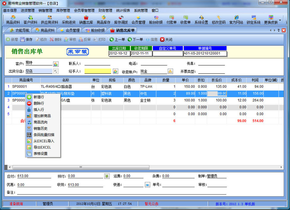 易特商业销售管理系统是一款专业的销售管理软件,其中包含商品销售管理系统 ,库存管理系统(仓库管理系统),财务和报表系统等子模块。软件界面设计简洁,美观,其人性化的软件流程,使普通用户不需培训也能很快掌握软件操作使用方法,上手极易。强大报表与集成查询功能是本软件的最大特色,所有功能在用户需要的使用地方自然体现,不用打开多个窗口重复查询。适用于商贸公司,个体门店等用于商业销售管理, 库存管理,财务管理等,客户管理,员工管理等场合,是您企业进行信息化管理的强大工具。