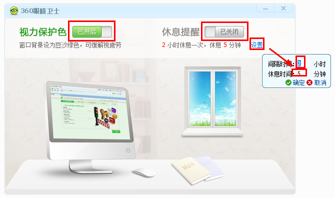 360眼睛卫士是一款非常贴心的护眼软件,是上班族们保护视力的最佳助手,使用方法也超级简单哦,只要点开启就可以启动护眼软件啦,开启后窗口背景就会设置成豆沙绿色,可以缓解眼睛疲劳,同时还会有贴心的休息提醒,提醒时间可以自已设置。360眼睛卫士是一款非常贴心的护眼软件,是上班族们保护视力的最佳助手,使用方法也超级简单哦,只要点开启就可以启动护眼软件啦,开启后窗口背景就会设置成豆沙绿色,可以缓解眼睛疲劳,同时还会有贴心的休息提醒,提醒时间可以自已设置。