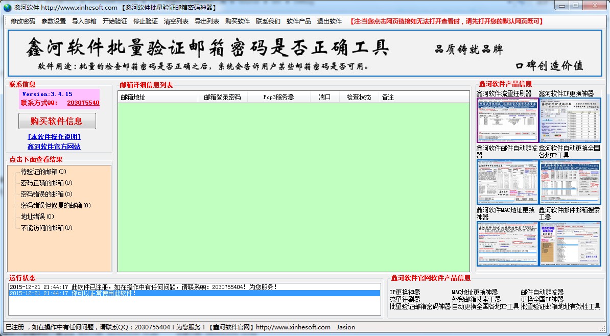 【鑫河软件批量验证邮箱密码神器(是否正确工具)的安装】 第一步:你要先解压,双击"鑫河软件批量验证邮箱密码神器.exe“打开 第二步:如果你没有软件的登录用户名和密码,请点击此软件上面的“没有软件登录帐号请点击这里注册一个”, 你可以申请一个用户和密码,就可以登录使用。 第三步:把将要验证的邮箱地址和密码按照如下格式保存为txt文本: 邮箱地址