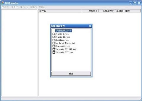 MPQMaster世界上最小, 最快的MPQ图形操作软件,可用来魔兽改图,修改初始界面。左栏是mpq文件内部路径,右栏是MPQ内部文件,右栏的文件是D2中的大部分资料和参数。可以在右栏中选种一个文件用右键解压缩将其解压出来。