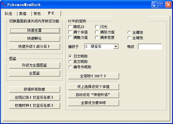 口袋妖怪mh修改器可以利用本程序,将队伍中的宠物从一个游戏读入,转而写入另一个游戏中。想修改队伍、数值、背包等值都不在话下,而且支持中文、日文、英文哦。[队伍]选项卡中的[技能]选项卡的使用说明:1) 技能列表:技能已经按照属性排序。2) 各版综合技能列表:在该列表中选择技能,双击“技能1”、“技能2”等,被选择的技能将出现在“技能1”、“技能2”等的列表中。
