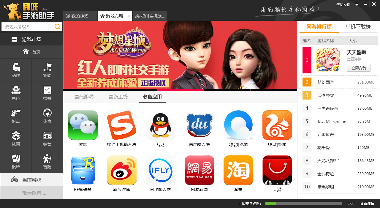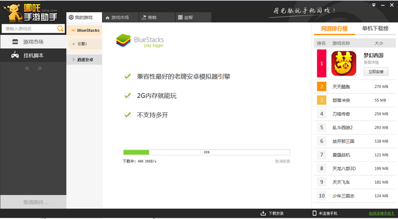 哪吒手游助手是一款免费的安卓手游模拟器软件,这款软件可以让你在电脑上运行安卓手机游戏,让你体验大屏玩手游的畅爽感觉。模拟器内置了大量热门的手机游戏供玩家下载,可以彻底解决手机玩游戏”没电、没网、没流量,屏小、声小、按不爽“的尴尬。没电、没网、没流量!屏小、声小、按不爽!用哪吒手游助手 ,爽!