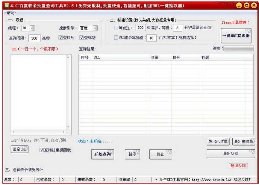 斗牛百度收录批量查询工具是一款功能强大的免费批量查询收录工具。1、软件完全免费,支持一次查询N个链接收录情况、快照时间、标题、收录率等,软件无任何限制。 2、软件支持多线程,无线程限制,除选项中的数值,线程数也可以自己设置,可直接填入数字即可。3、添加智能延时设置,适合大数据量的查询,同时支持URL抽查功能。 4、软件采用精确获取技术,查询速度很快;根据你的网速,如果你的网速飞快,查询速度也是飞快,一分钟几百URL查询没问题。