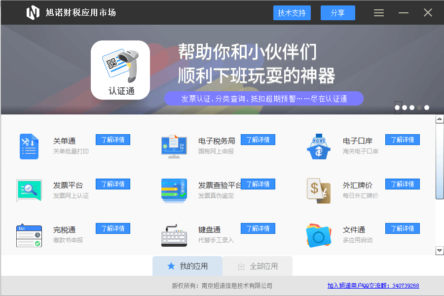 旭诺财税应用市场是南京旭诺信息技术有限公司自主开发的财税辅助软件,集出口退税申报、电子税务局、税控开票、报关单打印、缴款书申报、发票确认平台、发票验证、个税申报等功能为一体,将原本低效率、易出错的手工财税工作转化成全数字化作业,帮助企业财务高效完成财税工作。