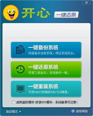开心一键还原工具是一个快速备份系统还原系统的工具。只需点击一键,即可恢复到最佳系统状态,专为电脑新手设计,操作更简单,更好用更安全!