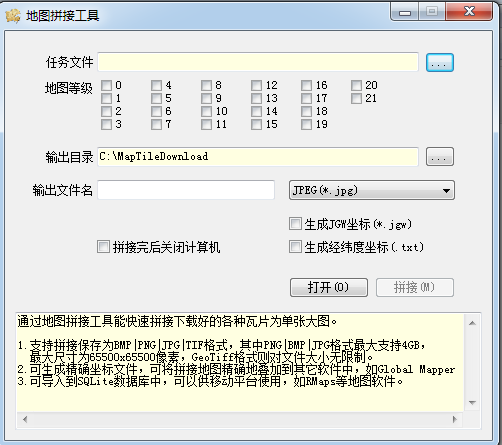 地图拼接工具是一款功能强大,好用的能帮助你将下载好的瓦片迅速拼接成大图的拼接地图工具软件,使用非常简单直观,生产效率高、速度快,是使用电子地图下载器时必备的工具。