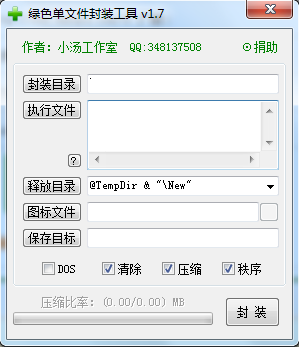 将小汤绿色单文件封装工具多文件绿色软件打包成单文件exe程序,支持格式有exe、bat、cmd。小汤绿色单文件封装工具选项说明:1、DOS :用命令行执行程序,也会出现黑窗口;2、清除:程序执行完毕后,自动删除释放的临时文件;3、压缩:新打包的程序通过UPX壳压缩