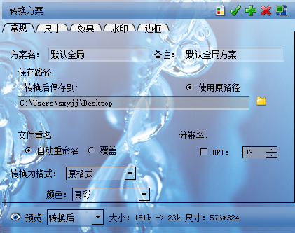 铭美图片多功能批量处理软件是一款可以批量对多种常见类型的图片按照预定义的方案进行批量的调整操作,调整的种类包括格式、色彩、尺寸、添加水印、添加边框等五个大项下面的30多个细节项目,通过灵活地组合使用,可以批量的快速处理海量的图片。