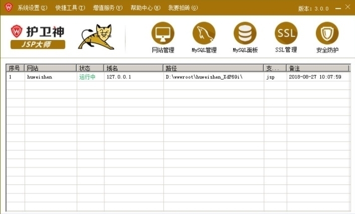 护卫神.JSP大师一键安装Tomcat+JSP+MySQL+FTP+SQL-Front;自带主机系统,在线开设网站和数据库,支持SSL证书,MySQL安全加固,自带安全检测工具,永久免费,适用于所有Windows系统。