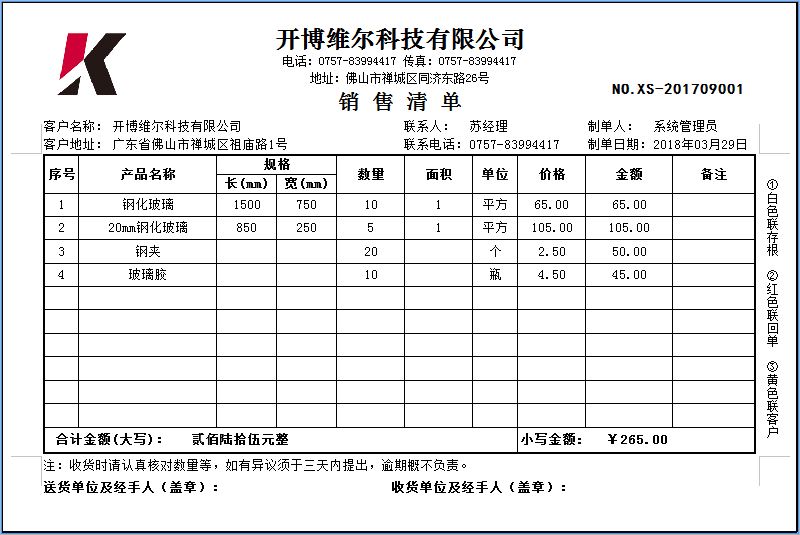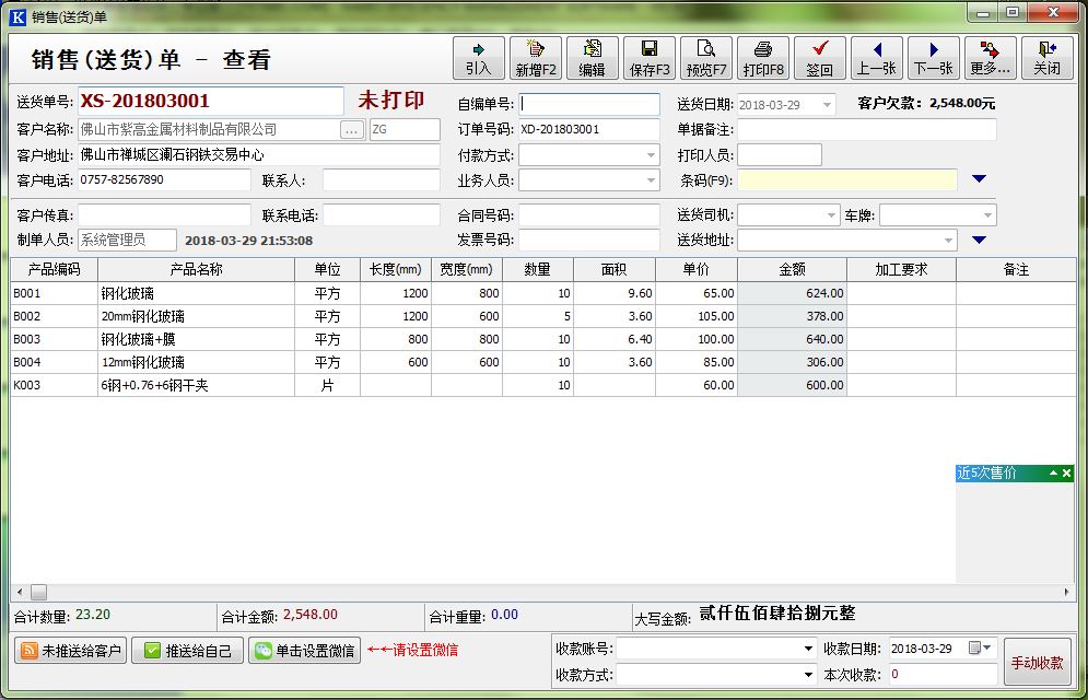 送货单管理软件(玻璃行业版)依据玻璃行业需求专门定制,完全可实现长*宽*数量计算面积从而实现计价(长*宽*数量=面积,面积*单价=金额),也可依据长度计价、依据数量直接计价,适应玻璃行业内的多种特殊需求。软件可以打印销售单、送货单、对账单、管理客户应收账款等,还可以下单后实时微信通知自己、员工或客户,功能实用,可快速上手。