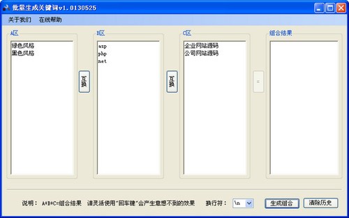 批量关键词组合工具,批量成生关键词 说明:A+B+C=组合结果 请灵活使用"回车键"会产生意想不到的效果 多种结果显示,方便使用。