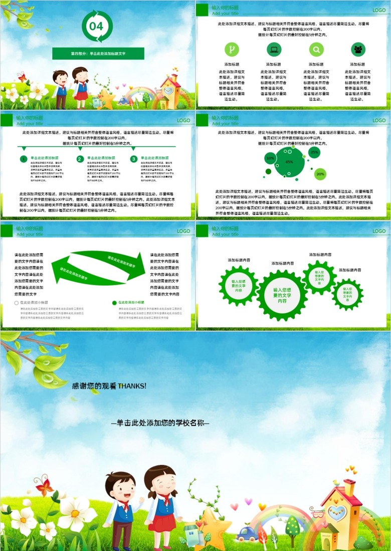 一年级家长会PPT模板是一套可爱卡通风格的,小学一年级家长会PPT模板,共27张;幻灯片模板封面使用了卡通蓝天白云、绿叶、草地、可爱小学生、小学校园等元素进行设计。界面设计充满童趣。PowerPoint模板内容页,由25张绿色幻灯片图表制作;本模板适合用于制作