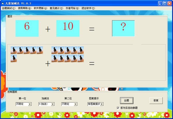 儿童加减法仅限于20以内的加减法,通过自动生成算式,配合可爱的动植物图案,让孩子快速学会简单的加减法!功能介绍1、操作简单,并且答对后自动换题 2、可以限定数字范围,以便于孩子从易到难; 3、提供答案功能 4、有图案提示,且图案有40多种常