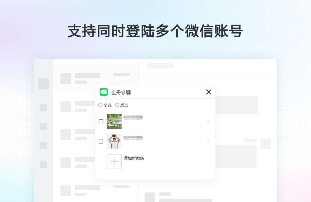 金舟多聊微信多开软件是一款简单、易用的微信电脑PC版多开工具,可以同时维护多个微信号,微信消息提醒让管理更加便捷,可以有效提升客服人员沟通效率,帮助企业用更少的客服,服务更多客户。