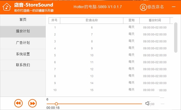 店音播放器为助你店铺音乐服务系统的PC客户端,旨在为连锁店轻松实现统一的店铺音乐风格,完善品牌听觉形象。店音播放器主要特点有:1. 远程集中管理,总部在线统一管理各分店的店铺音乐,总店曲库更新后,分店自动同步更新;2. 播放计划,指定时间播放指定歌曲