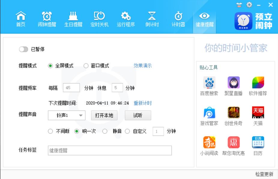 预立闹钟,是一款专注于PC端的免费闹钟软件,准时提醒您的大小事项,多种提醒方式,为您的时间管理添砖加瓦。