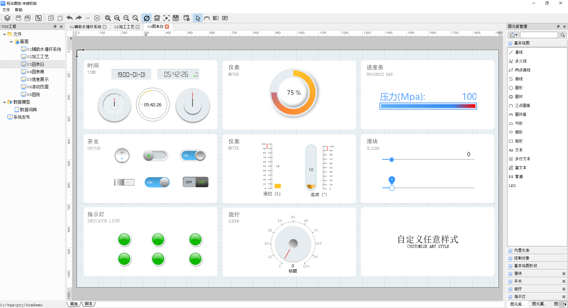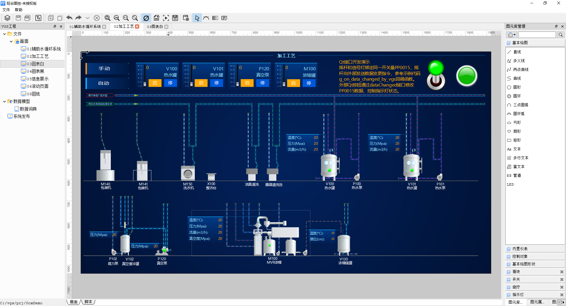 旺谷图控针对软件UI图形界面开发提供了一种高品质、高效率的开发方法,基于美工UI界面设计,结合脚本化编程,可快速将UI设计方案转换成软件产品。旺谷图控可广泛用于C++/Qt/C#/MFC/VB等UI界面中的数据图视化展示,也支持多种工业软件如WinCC/Intouch/组态王/力控/LabVIEW /MATLAB 等等的组态画面或HMI人机交互界面的嵌入集成开发。