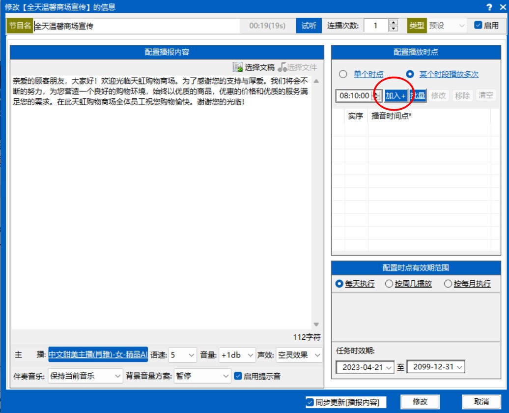 智友播音大师是一款专为超市商场等公共广播环境设计开发的智能语音播报系统,可以代替播音员进行广播的自动广播系统,独家搭载第七代云端发音引擎,配合内置的定时播控系统,设置不同时点时段的定时播音任务