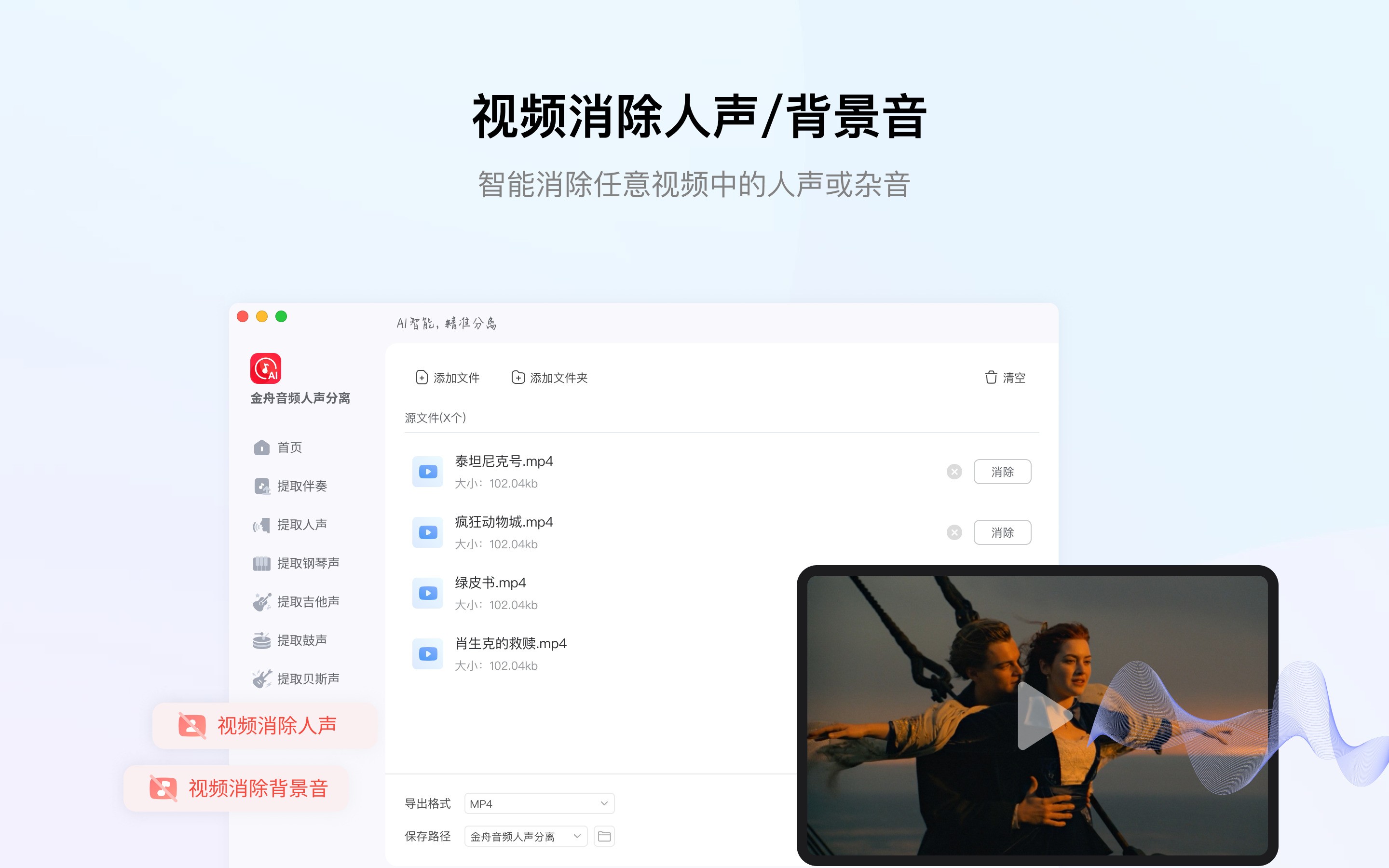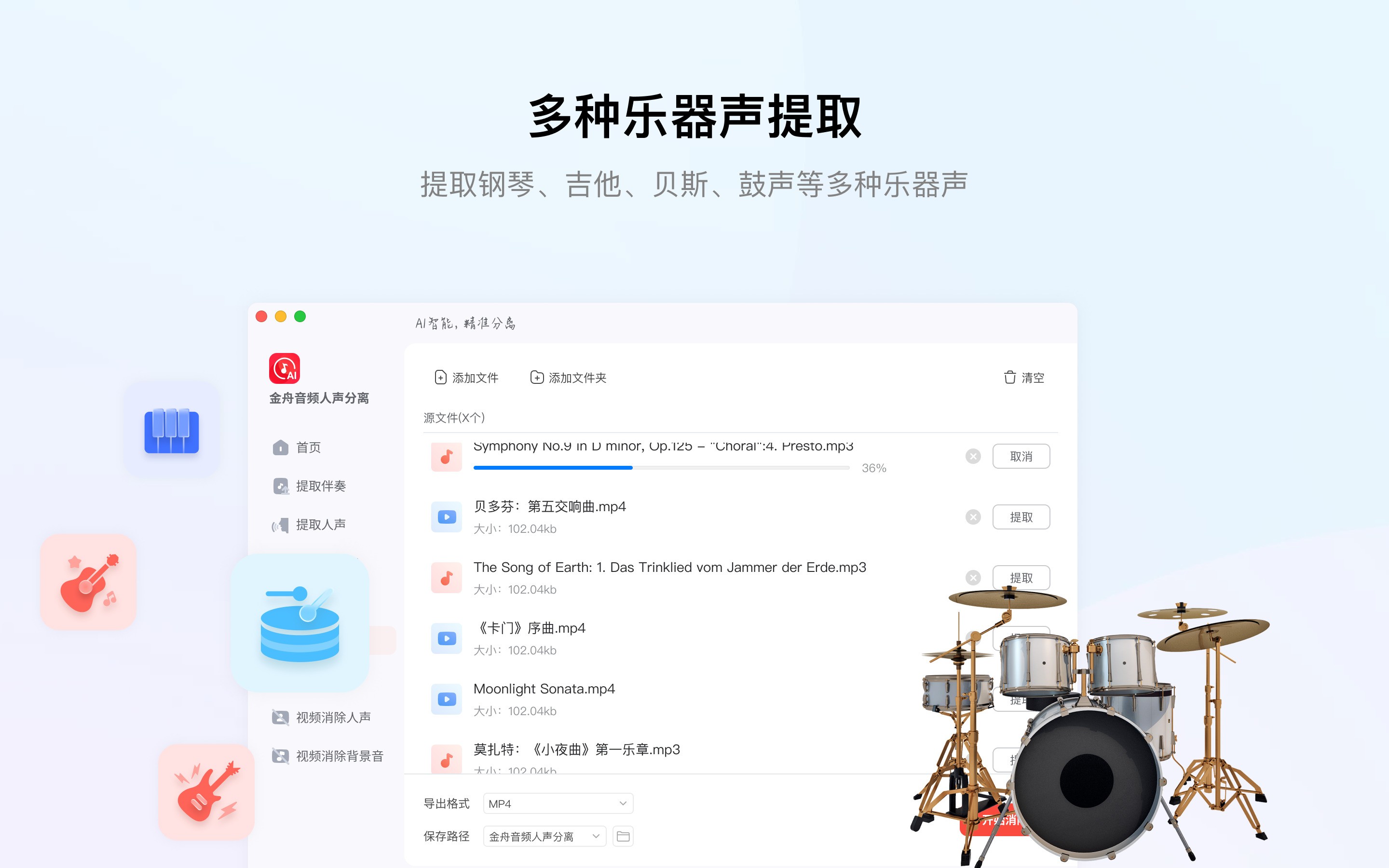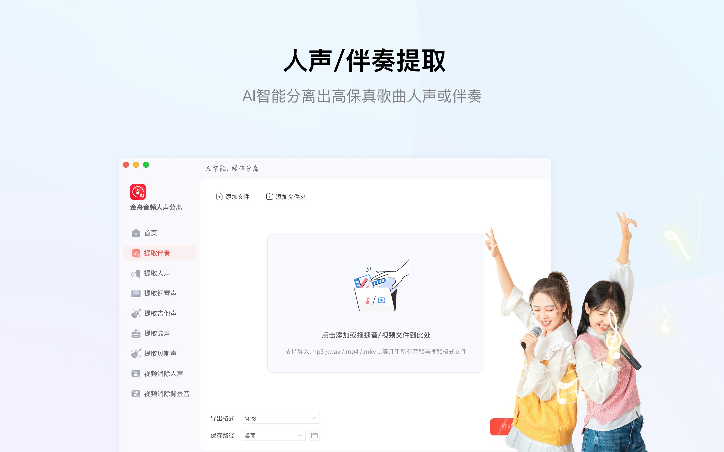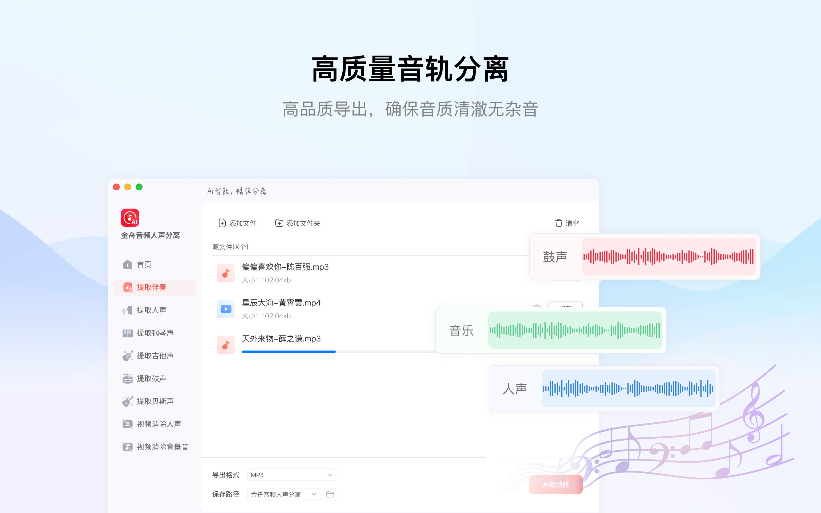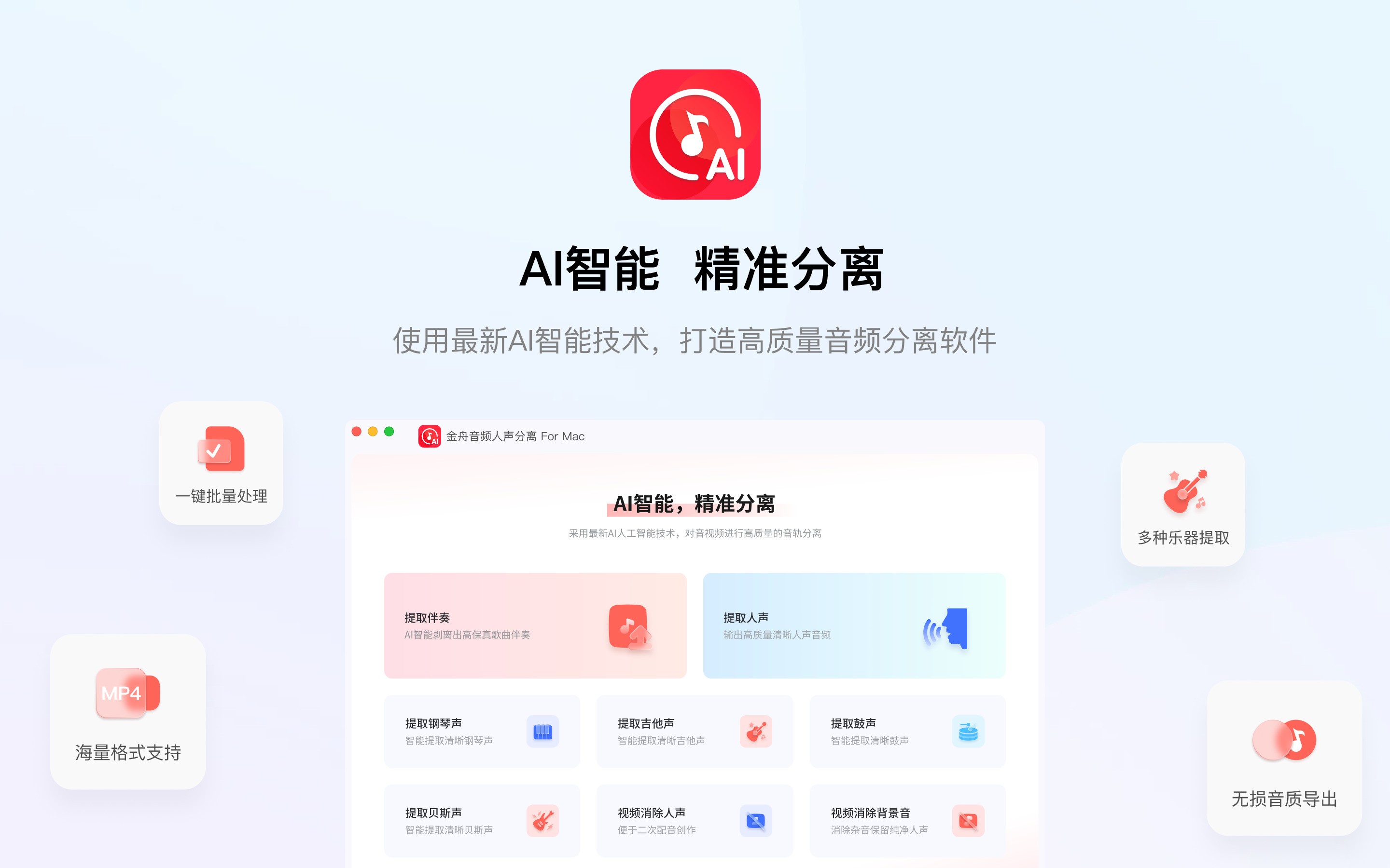 金舟音频人声分离软件For Mac可帮助用户进行伴奏和人声分离,可以选择去除人声或者提取伴奏,支持从音频、视频、音乐、歌曲中提取伴奏,提取人声,同时还支持提取钢琴、吉他、贝斯、鼓声等多种乐器声