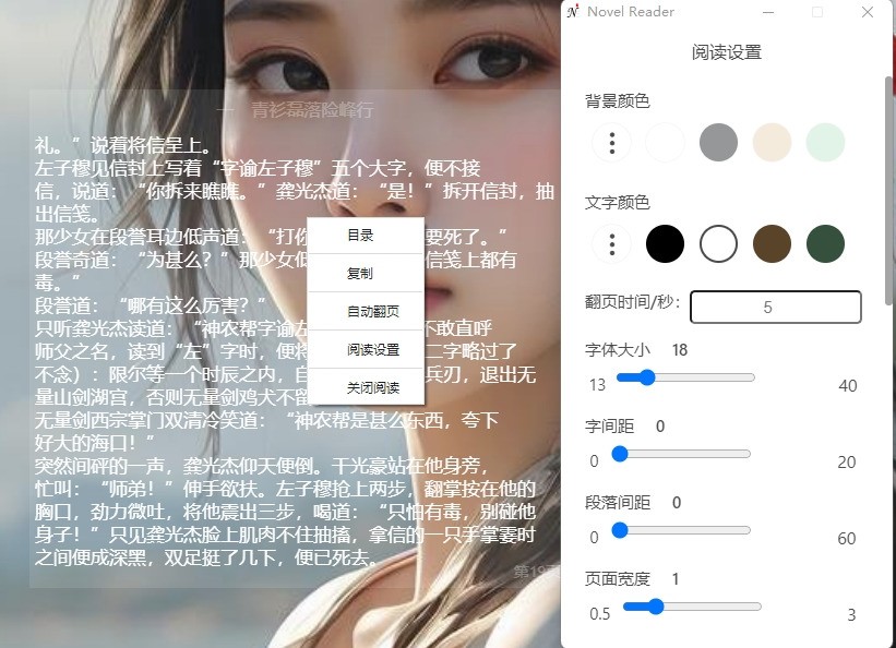 NovelReader,小说阅读器、视频摸鱼、视频盒子、视频解析。图书导入,支持epub、txt、pdf、docx、mobi、html、xml、azw3、fb2、cbr、cbz、cbt、md等20种文档格式,自定义快捷键、老板键、简繁体翻译、鼠标翻页、快捷键翻页、按钮翻页、定时自动翻页、可调整背景透明度、窗口缩放移动、字体大小和颜色,极其小巧精致。您在上班期间,可放心地偷偷阅读小说、视频,非常隐蔽,避免被同事、老板发现。