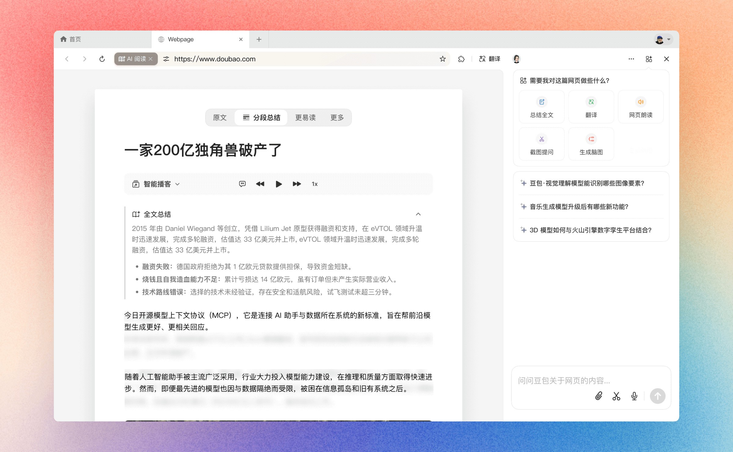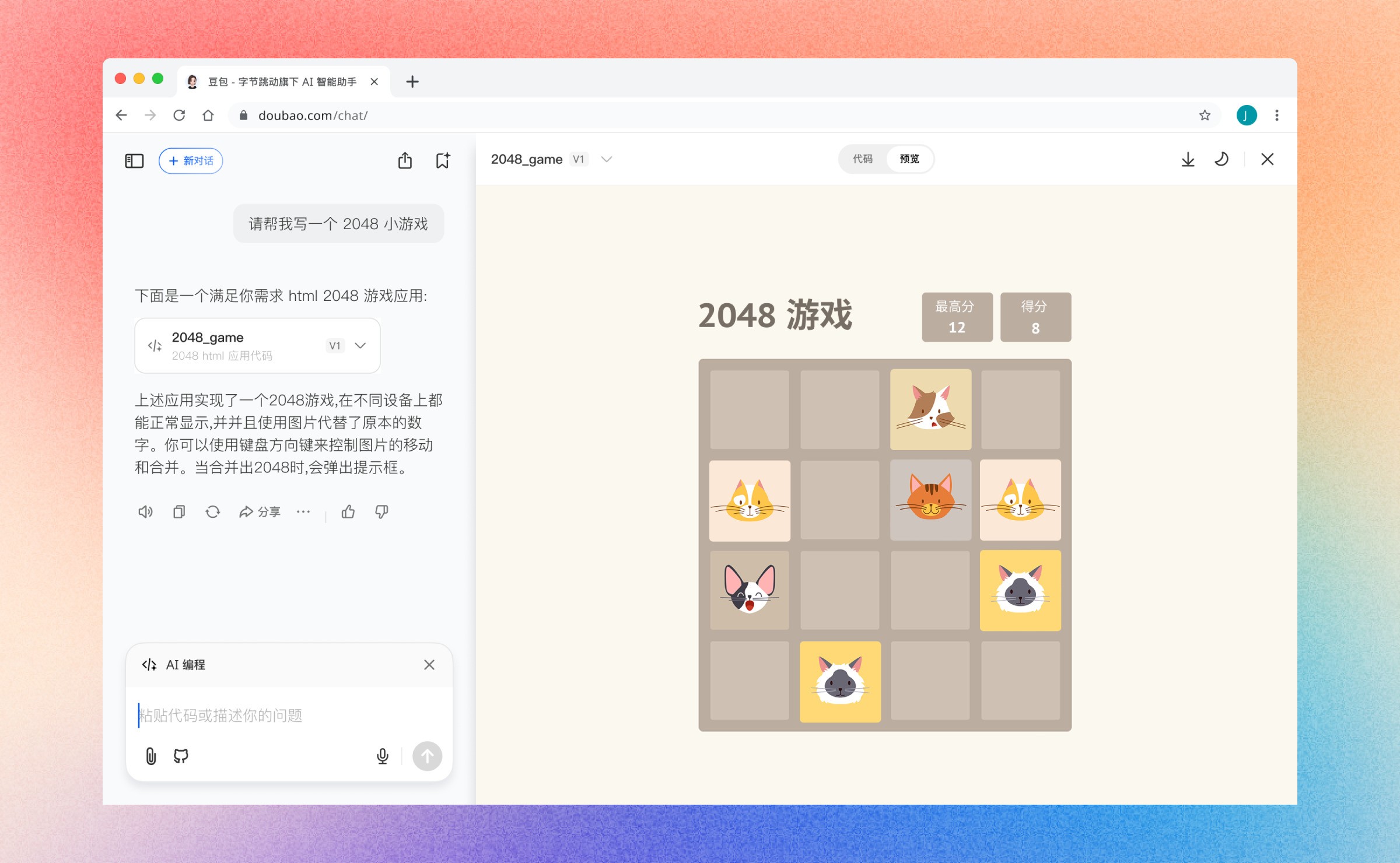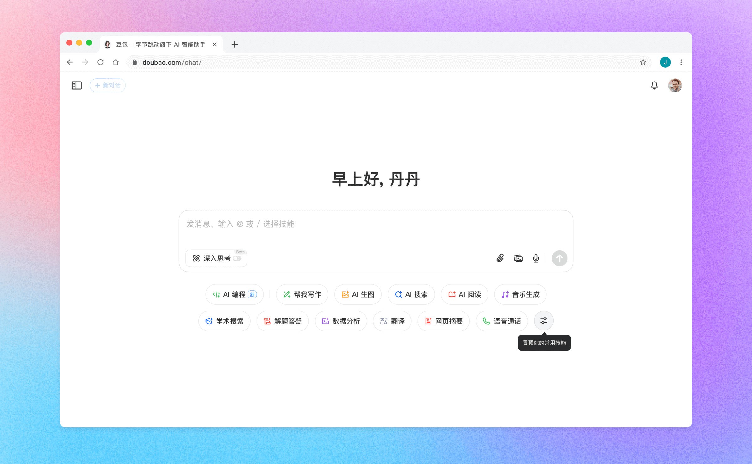 豆包是你的多功能 AI 助手,为你的生活、学习、工作提供帮助。豆包可以为你搜索信息,解读时事新闻,答疑解惑,分析总结,提供灵感,辅助创作。