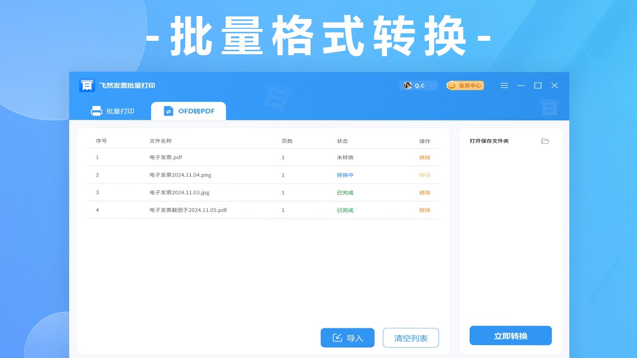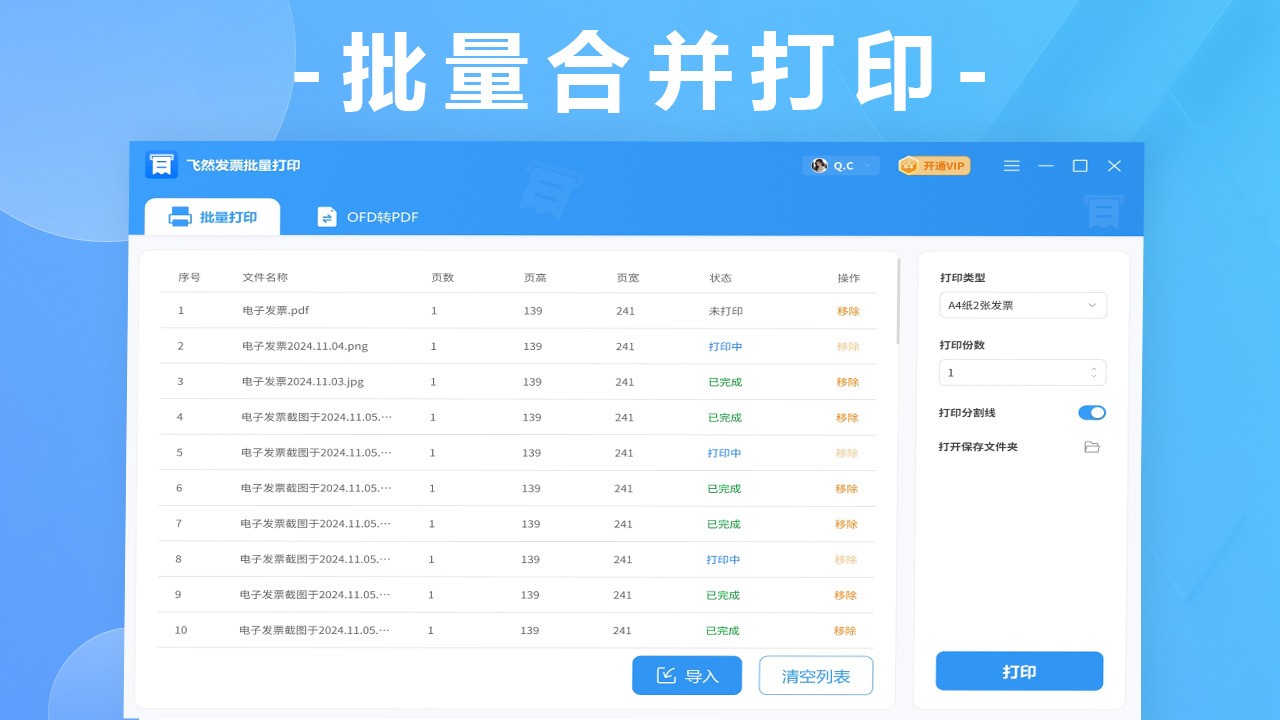 飞然发票批量打印软件是一款专为企业财务、个体经营者设计的发票合并打印工具,支持OFD/PNG/PDF格式电子发票的批量导入与智能处理。用户可通过拖拽文件或一键添加实现快速导入