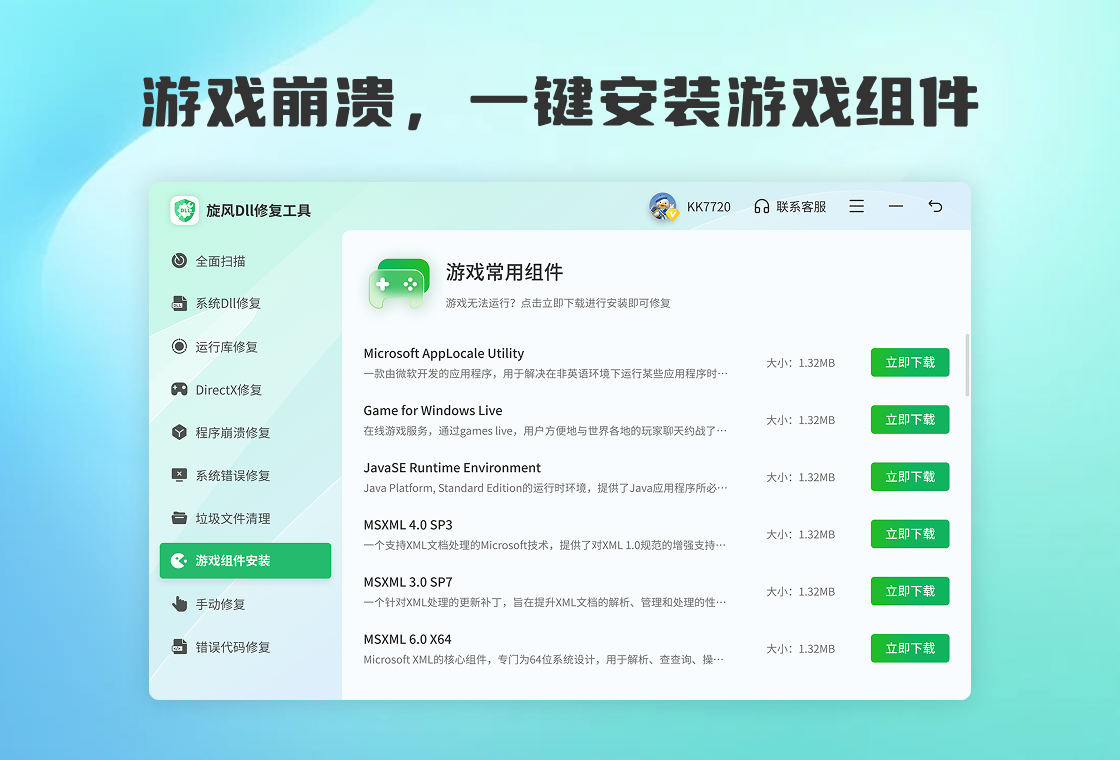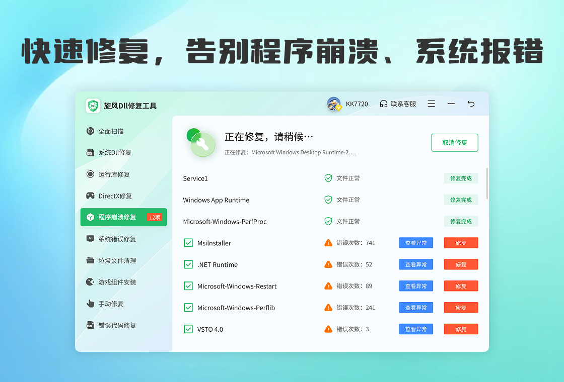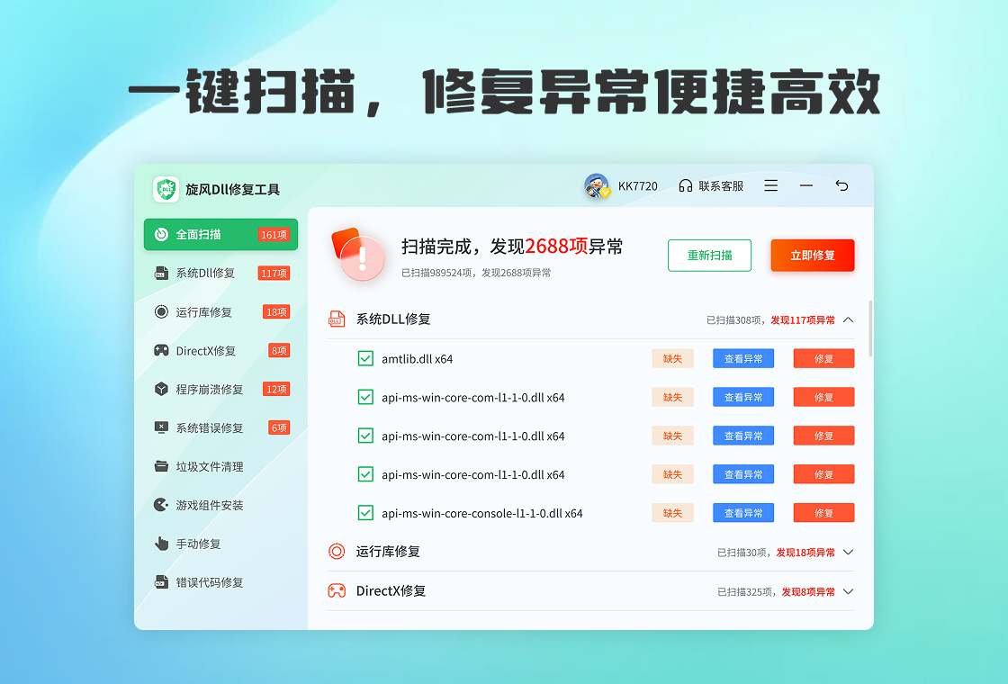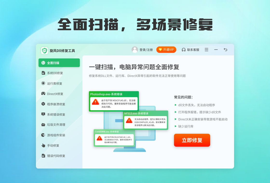 旋风DLL修复工具是一款专业的DLL文件修复工具,用户可以一键扫描并修复DLL文件,为用户解决因DLL缺失导致应用程序无法启动、报错,系统提示找不到DLL文件或文件损坏,游戏启动崩溃、黑屏或提示错误等问题。
