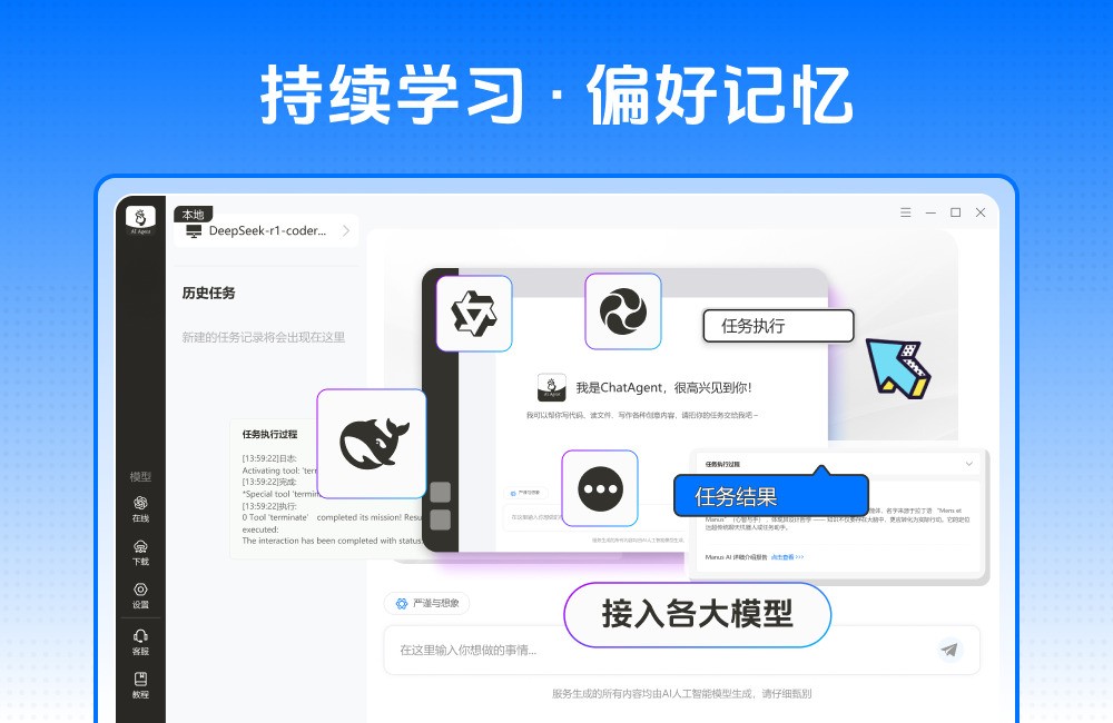 AI Agent本地部署,通用型AI智能体助手本地安装,ChatAgent本地部署工具是一款简单易用、功能超强的通用型AI Agent本地化一键安装部署软件,免去繁琐配置流程,零基础用户也能快速部署属于自己的通用型AI智能体。