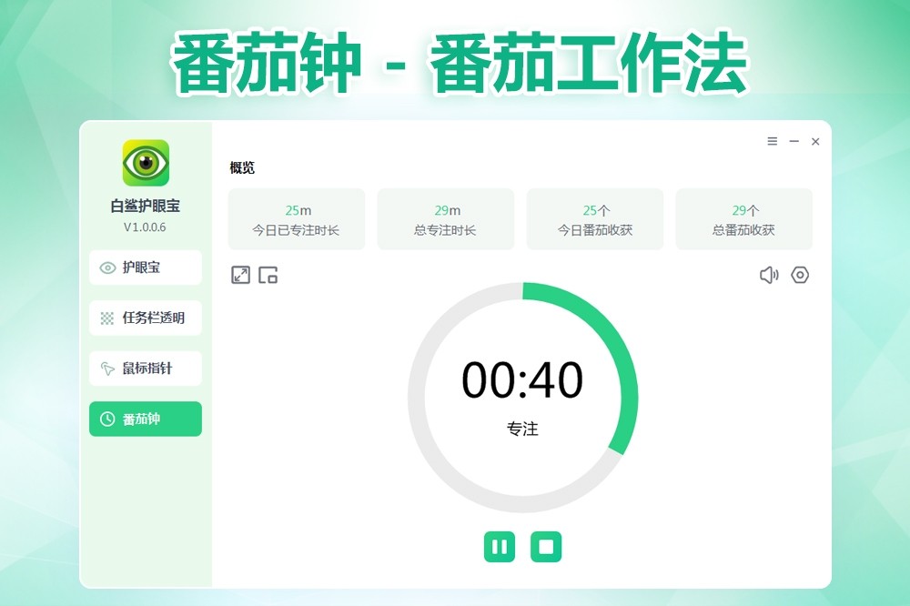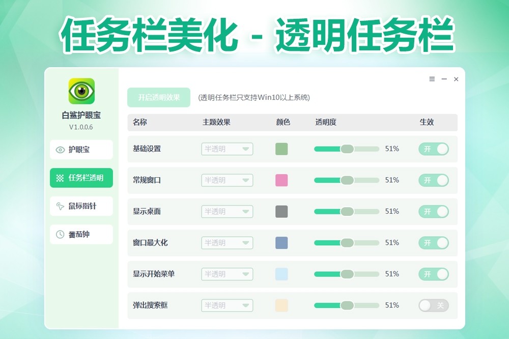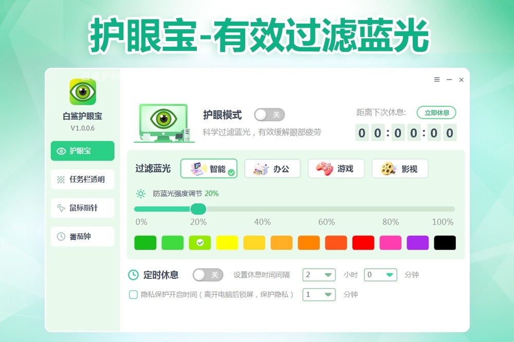 白鲨护眼宝,有效防蓝光,任务栏透明,鼠标指针美化,番茄钟等功能,支持智能护眼、办公护眼、游戏护眼、影视护眼,护眼更精准,智能过滤蓝光、拦截屏幕90%蓝光、保护眼睛从屏幕开始。白鲨护眼宝,守护你的电脑屏幕。