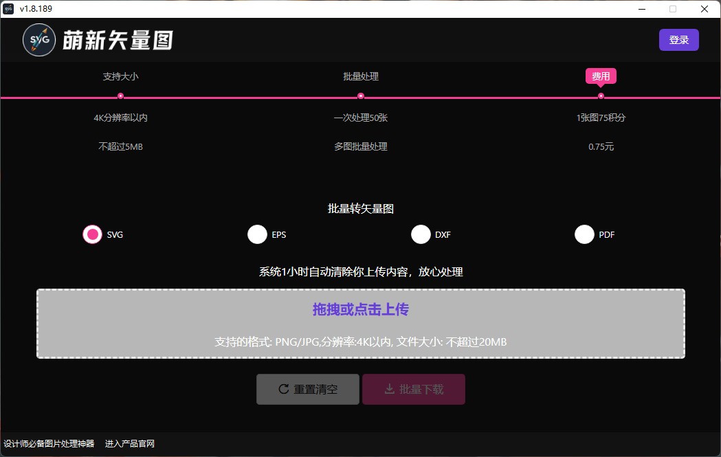 萌新矢量图转换器工具小巧睿智、高效易用。一键在线将JPG、PNG图片自动转换SVG(.ai),EPS,DXF(.dwg),PDF四种格式,生成的矢量图像放大数千倍仍颜色艳丽、边沿清晰不丢失细节,支持Adobe Illustrator、CorelDRAW、Autodesk AutoCAD等设计软件进行再次编辑修改,用最低的成本提升设计领域的工作效率。