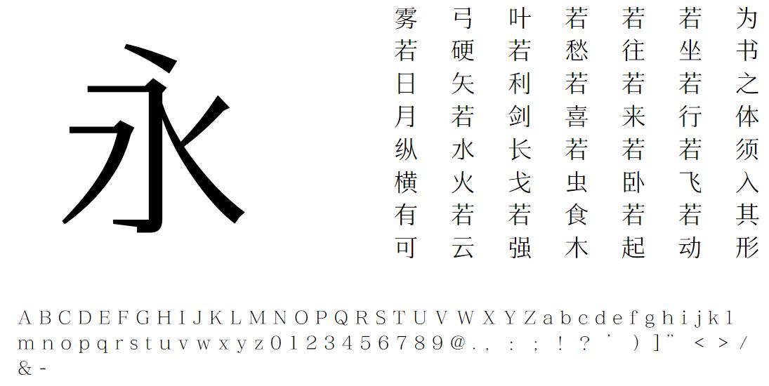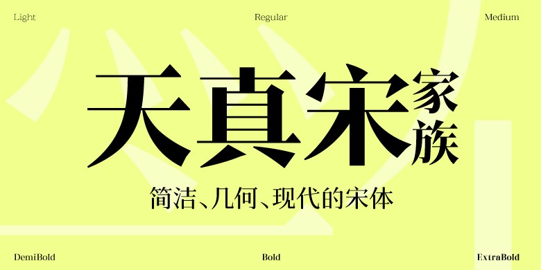 方正天真宋家族,天真宋是一款简洁、几何、现代的宋体,骨架均匀、笔画极简,充满明快干净的少年气。这款字形是第十届方正奖专业组优秀奖的作品。
