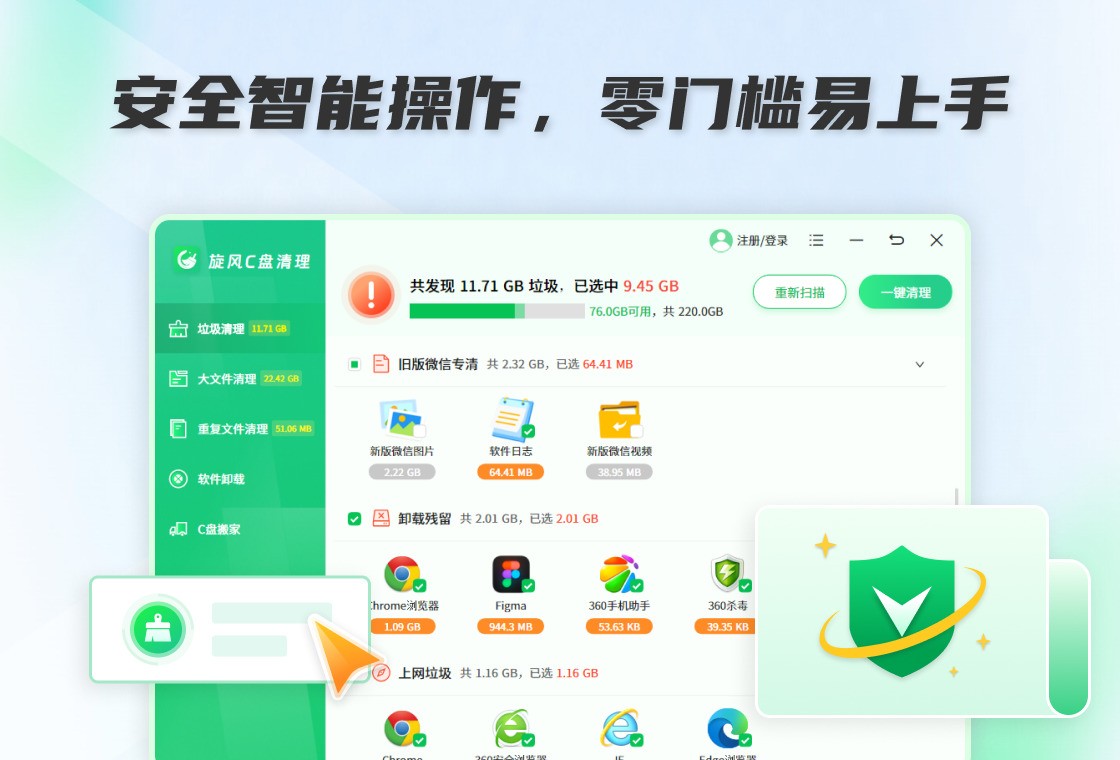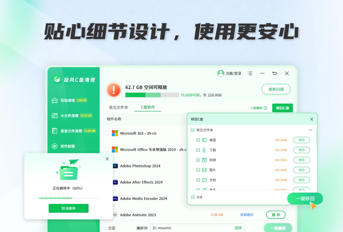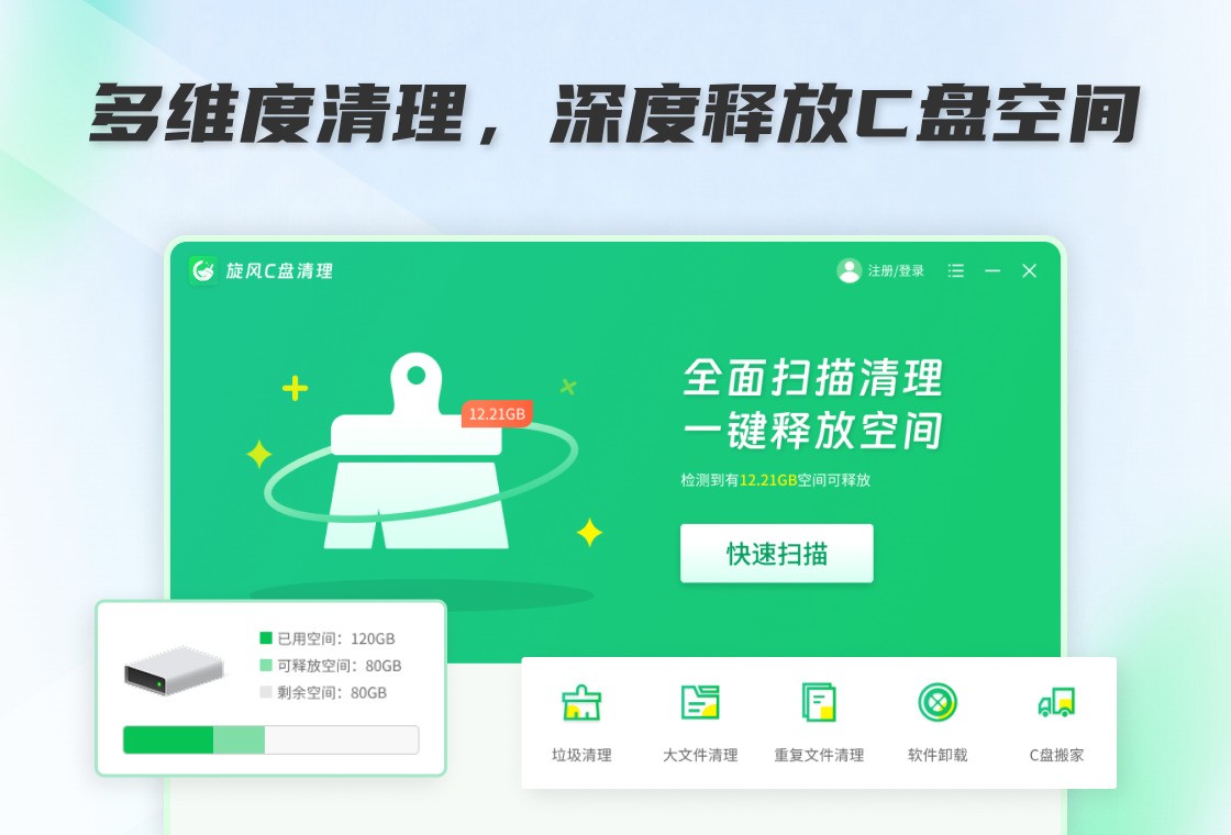 C盘爆红、电脑卡顿?旋风C盘清理包含垃圾清理、大文件清理、重 复文件清理、软件卸载、C盘搬家等多项功能,一键扫描冗余数据, 精准释放存储空间。无需重装软件即可搬移程序,全流程安全防护 规避误删,操作简单。