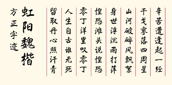 方正字迹-虹阳魏楷,虹阳魏楷(与弘扬魏楷谐音)寓意:象彩虹一样绚丽,象太阳一样灿烂。寄望使用虹阳魏楷的人士充满阳光灿烂,事业蒸蒸日上。将传统书法创作成电子字库,是运用现代电子技术展现中国传统书法艺术独特魅力的创举,也是新时代增强文化自信的有益措施。“书为心画”,毛笔字迹的创作,不仅需要书法家熟练掌握传统书法的笔法、字法、章法,还需要对中国传统文化的深刻理解。 方正虹阳魏楷体的创作就是一段集专注与挚爱、传承与创新于一体的探索之旅。在继承和创新中体悟到弘扬传统文化的使命。虹阳魏楷笔法上选取二王一路“一拓直下”的笔法,做到一笔成形,讲究气脉连贯,强调书写性。字形结构上,以唐楷的紧密规范为基础,融入魏碑的飘逸洒脱。具有独特风格,既规范又活泼,既易于辨认又具有可观性、艺术性。 适用:方正字迹--虹阳魏楷体,用笔灵活多变,方圆兼具,讲究一笔成形。结体紧密,吸纳唐楷精密规范的优点和两晋碑体飘逸的风范。适用于诗歌、文章的排版,以及文化、商业类品牌广告语设计,也适用于各类牌匾。尤其适用于独立,喜与众不同,文艺情怀爱好者,应用于标题,包装,海报,广告,文化印刷品及周边。