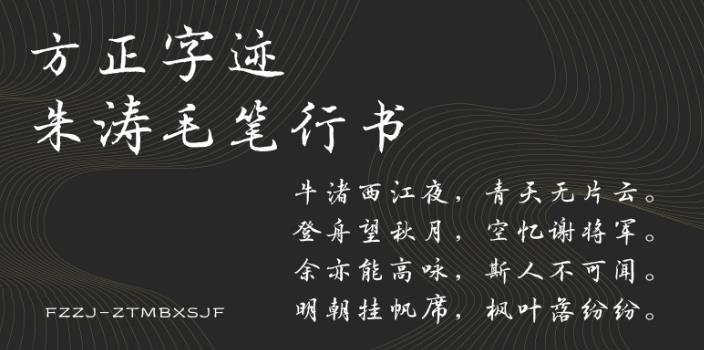 方正字迹-朱涛毛笔行书,由著名书法家朱涛创作。书风灵动典雅,潇洒秀逸,笔法精到,结体精致,线条畅快富有动感,具有行云流水般的韵味。适用于各类图书出版、商业品牌广告和产品包装设计,各类机构会议文件设计,以及影视和游戏设计等。